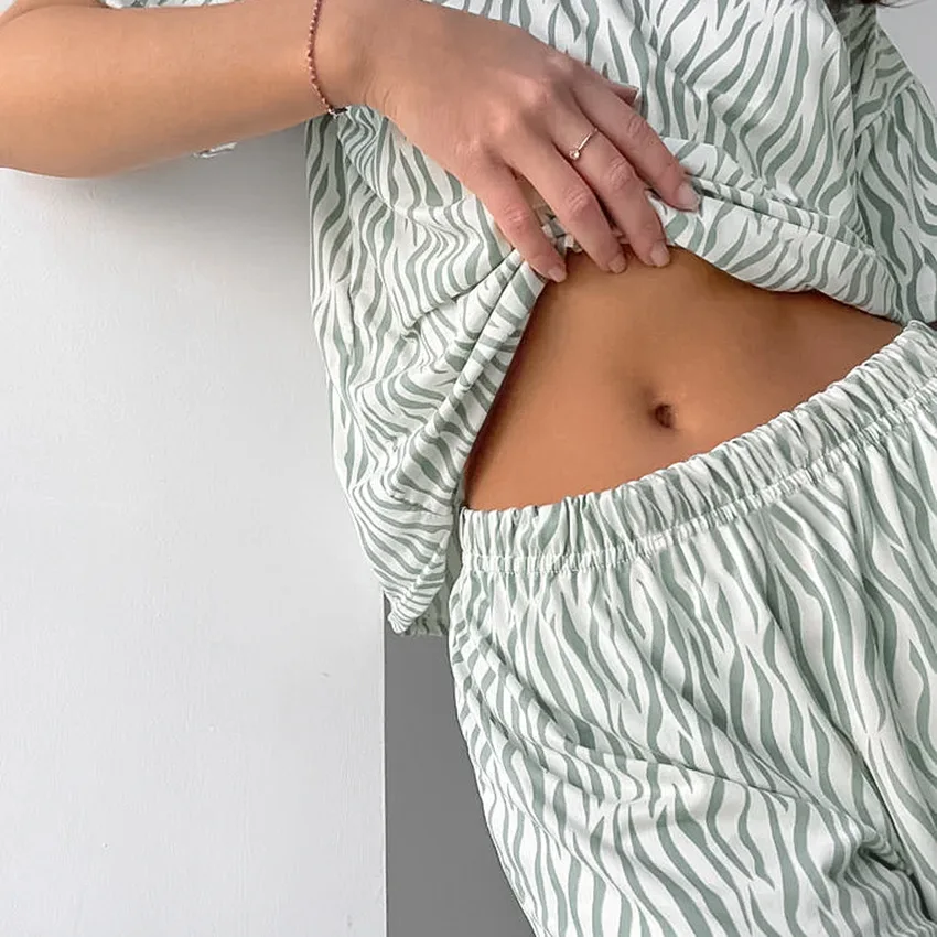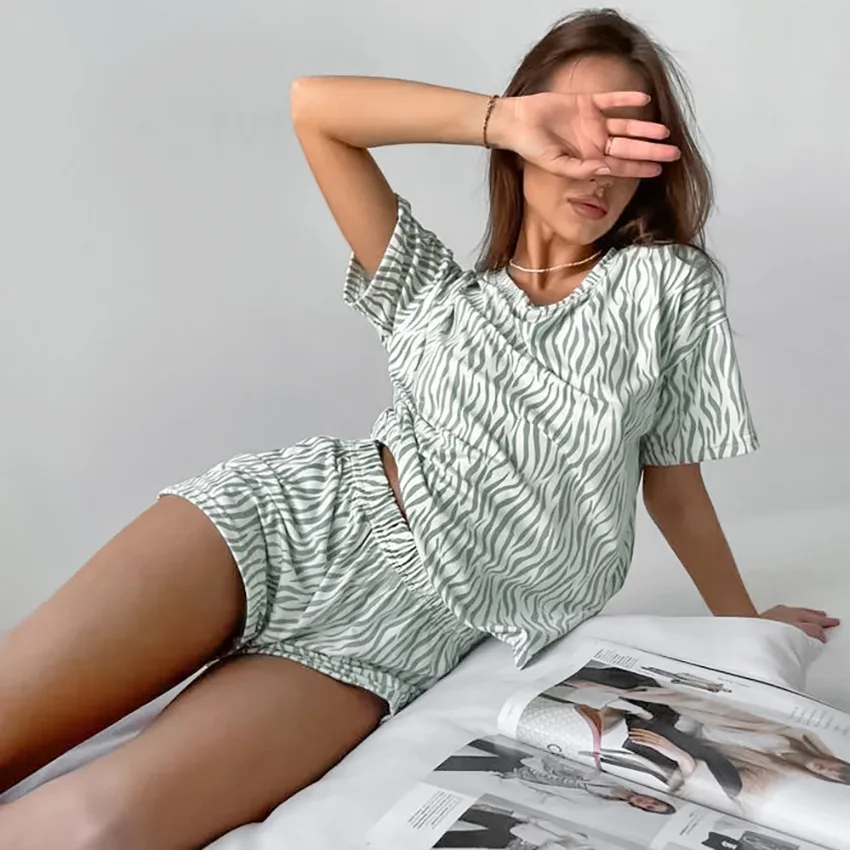 Hot Summer Sale Plus Size Striped Print Pajamas Green Short-Sleeved Soft Sleepwear Breathable Sexy Shorts